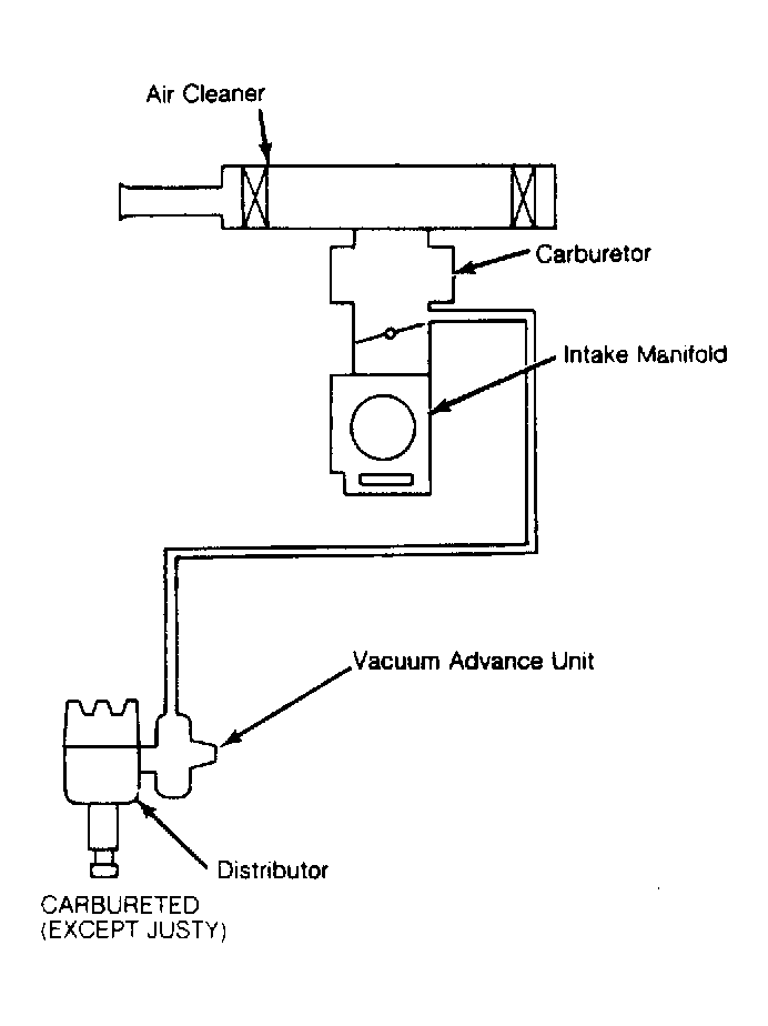 The Justy distributor is equipped with both vacuum and electrical advance. Electrical advance is constantly operative, and is controlled by Ignition Timing Unit (ITU). On all other models, distributors are equipped with vacuum advance only. Vacuum advance on both systems is controlled by engine vacuum. The Justy system is equipped with a dual-diaphragm advance unit. Intake manifold vacuum is applied to auxiliary side of distributor vacuum control unit during idle, low-load operation and deceleration in order to provide an advance angle.