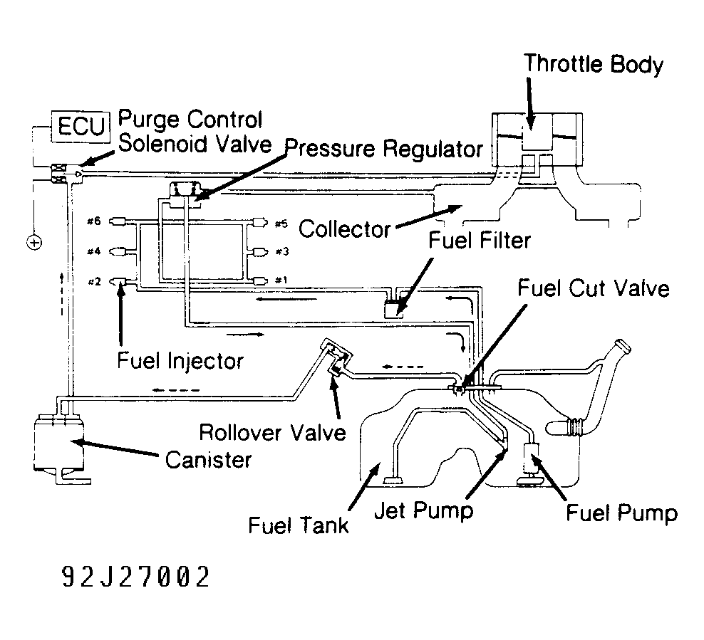 Remove fuel filler cap. Disconnect vent hose between charcoal canister and fuel tank. Blow air toward canister. Ensure air flows freely into canister. Blow air toward fuel tank. Ensure air flows into tank with a slight resistance from 2-way valve. See Fig 1