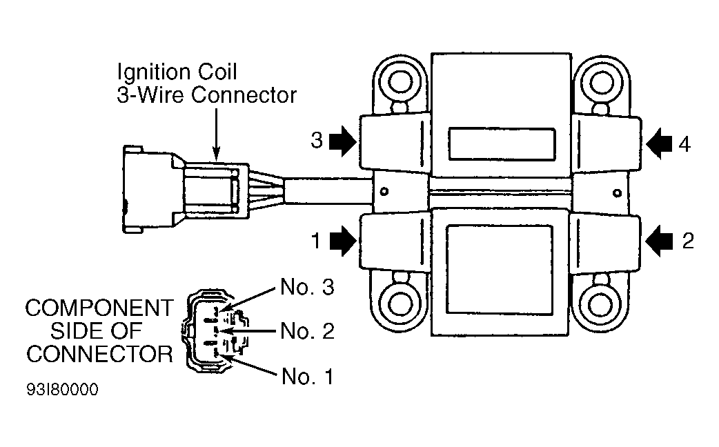 3. Check Ignition Coil  - Verify .7 ohm resistance between ignition coil connector terminals No. 1 and 2, and No. 2 and 3. Verify 13,800 ohms resistance between spark plug wire towers opposite each other. If specified resistance is present, go to next step. If specified resistance is not present, replace ignition coil. See Figure .