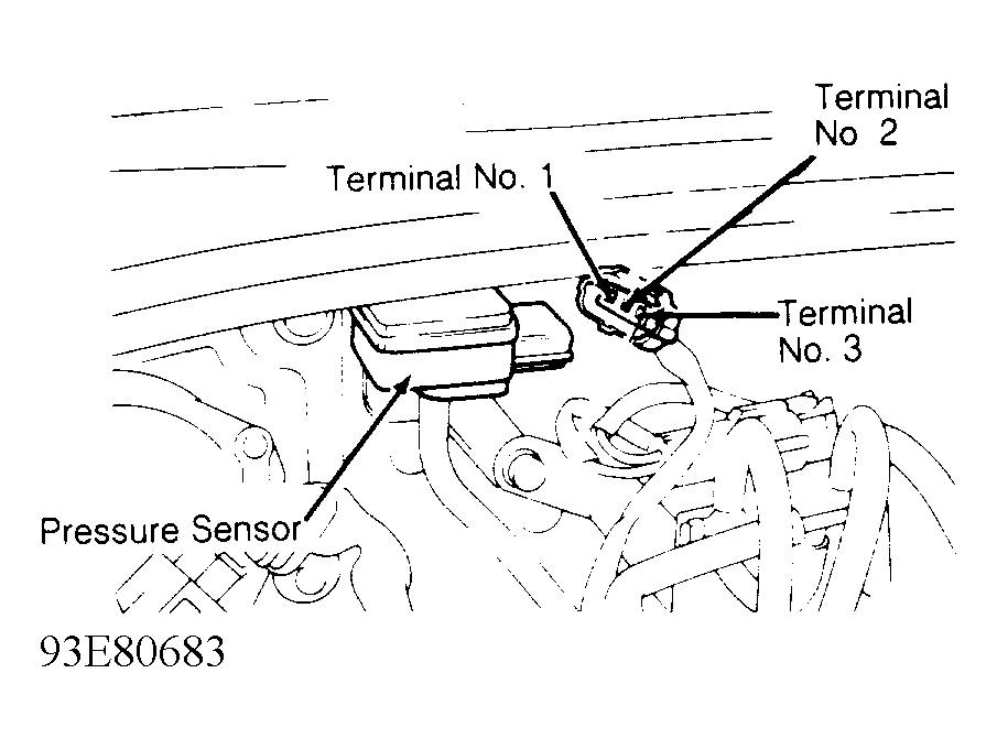 2. Reconnect ECU connectors. Measure resistance between terminals No. 1 and 2 and between terminals No. 3 and 2 of pressure sensor connector. See Fig 1 . If both resistances are infinite, go to next step. If either resistance is not infinite, repair connector and/or wiring harness as necessary.
