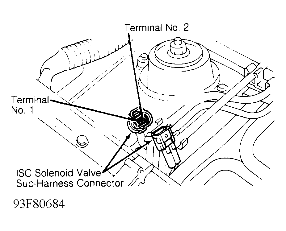 - Disconnect ISC solenoid valve sub-harness connector. See Fig 1 . Turn ignition on. Measure voltage between ground and terminal No. 2 of sub-harness connector. If voltage is more than 9 volts, go to next step. If voltage is less than 9 volts, repair ISC power circuit as necessary.