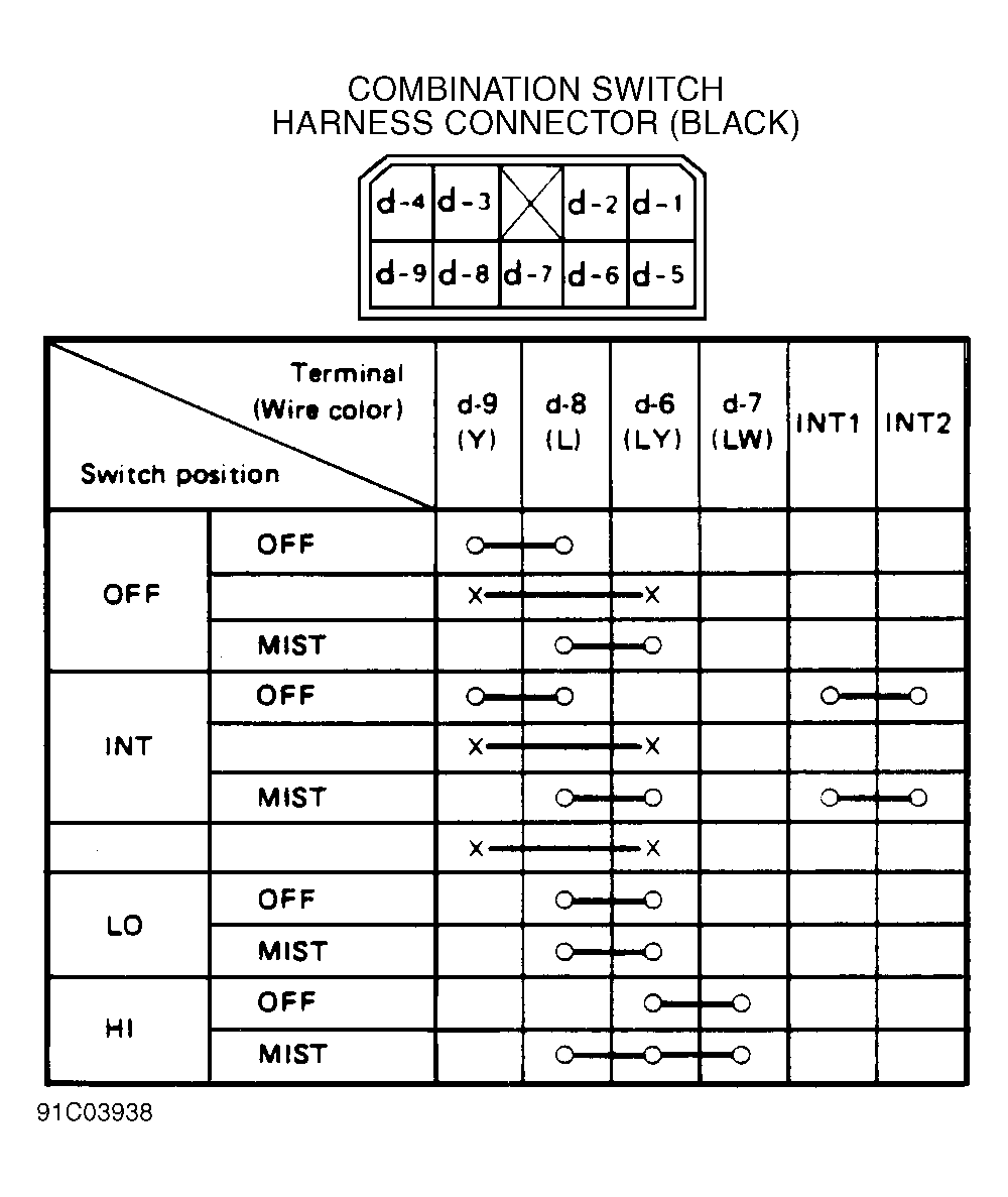 - Check continuity between terminals d-2 (White wire) and d-5 (Black wire) of combination switch connector. SeeFig 1 .