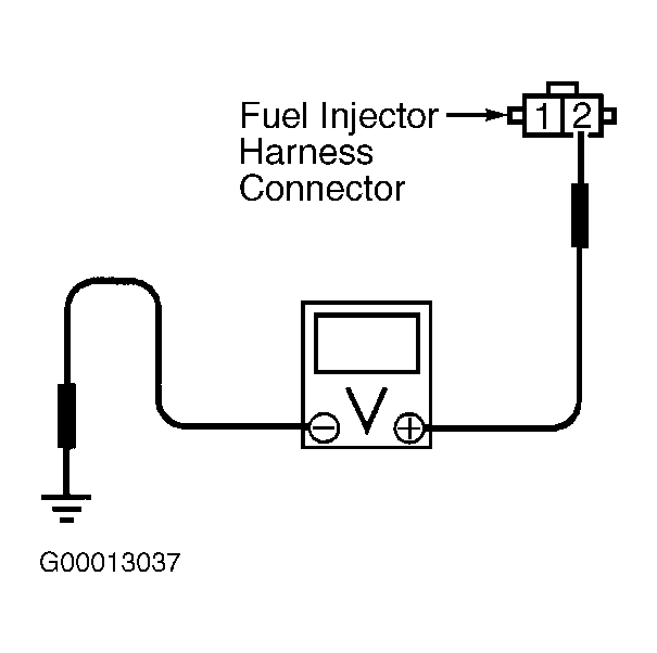 Turn ignition off. Disconnect connector at each fuel injector one at a time. Turn ignition on. Using a voltmeter, measure voltage between connector terminal No. 2 and engine ground. See Fig 1. If voltage is more than 10 volts on any injector circuit, go to next step. If voltage is 10 volts or less on any injector circuit, repair open circuit in harness between main relay and fuel injector and check for poor contact in all connectors between main relay and injector. See appropriate wiring diagram in WIRING DIAGRAMS article.