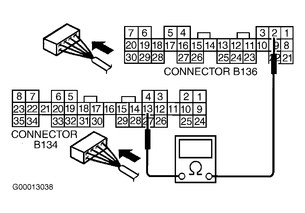 Turn ignition off. Disconnect ECM connectors B134 (35-pin connector) and B136 (30-pin connector). Backprobing connectors, measure resistance between ECM connector B134 (35-pin connector) terminal No. 4 and ECM connector B136 (30-pin connector) terminal No. 2. See Fig 2. If resistance is 5-20 ohms, leave connectors disconnected and go to next step. If resistance is not 5-20 ohms, repair open circuit in harness and check for poor contact in connectors.
