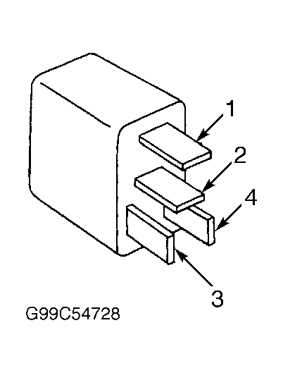 - Connect DVOM between horn relay terminals No. 1 and 2. Connect battery voltage to relay terminal No. 3 and ground to relay terminal No. 4. If continuity exists, check horn circuit. Repair as necessary. If continuity does not exist, replace horn relay.