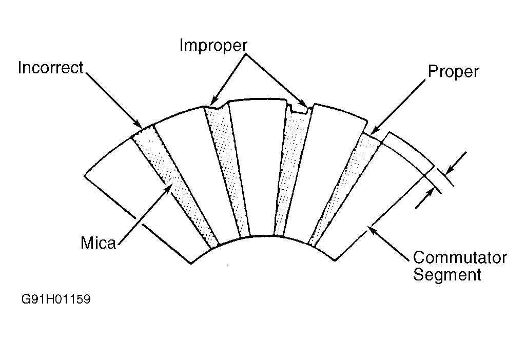 4. If correcting runout condition, DO NOT reduce commutator diameter below specification. Undercut mica insulation if it is even with or higher than commutator surface. See Fig 1. See STARTER SPECIFICATIONS .