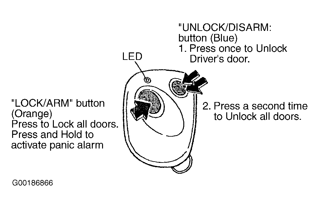 The keyless entry system consists of a transmitter, keyless entry control module (with a built-in antenna), door lock actuators, door switches, horn and interior light. The keyless entry system operates on a radio frequency, so its transmitter can be used in almost all directions relative to the vehicle. The keyless entry system locks and unlocks vehicle doors and rear gate, sounds a panic alarm, and arms and disarms the security system (if equipped). The keyless system's operable distance is approximately 30 feet (10 meters). This distance will vary depending upon environmental conditions. Range may be reduced near RF interference sources, such as power plants and radio/television broadcasting towers. The keyless entry system does not operate when the key is inserted in the ignition switch. See Fig 1 .