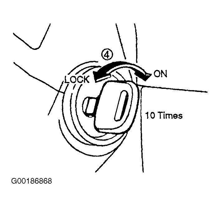 4. Place the ignition key into ignition switch and cycle the switch from LOCK to ON ten times within 15 seconds. Be sure to stop at the LOCK position. See Fig 1 . The horn will sound once to indicate that you are in transmitter programming mode.