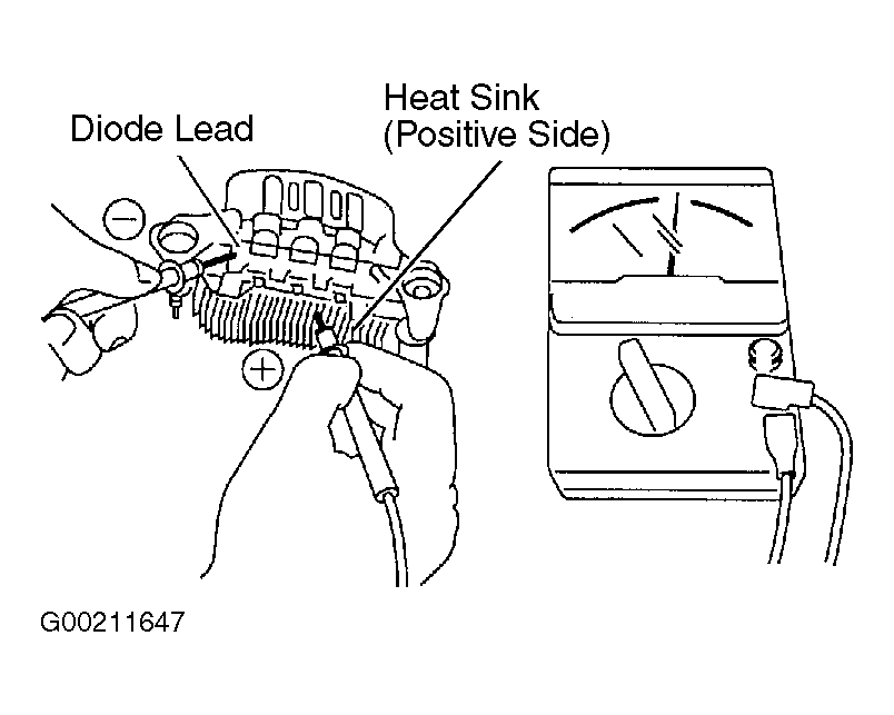 Check continuity between diode lead and positive side of heat sink. Connect ohmmeter positive lead to diode lead and negative lead to heat sink. See Figure . Continuity should exist. Reverse ohmmeter leads. Continuity should not exist.