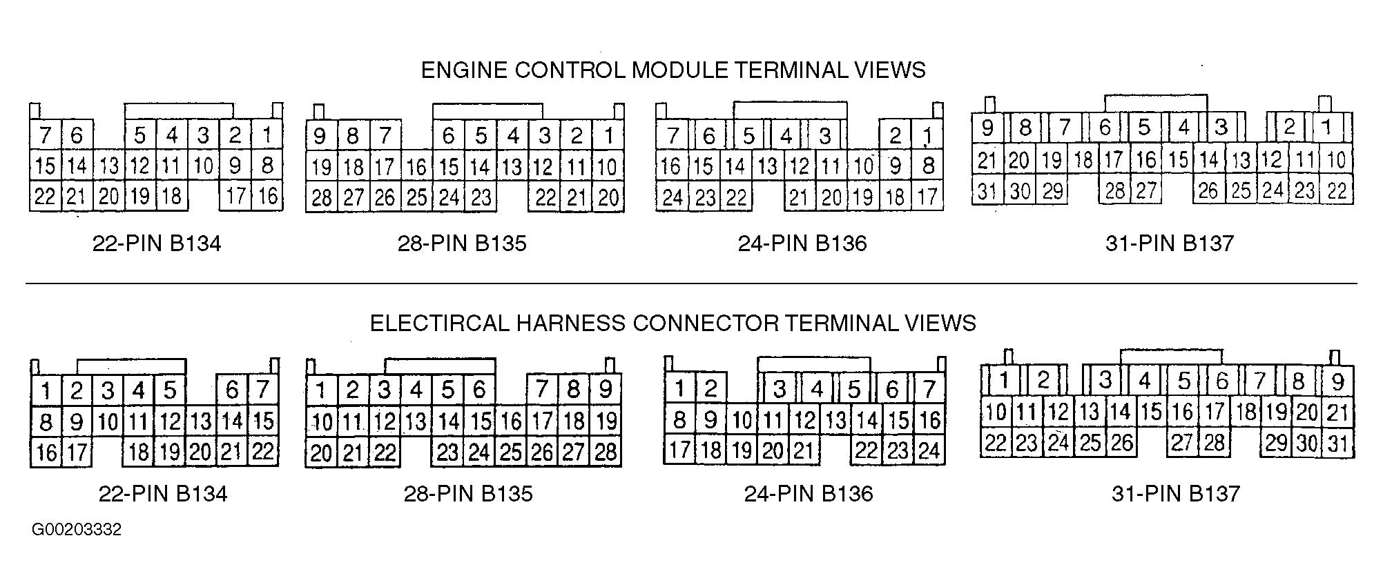 ECM Connector & Terminal No. (Wire Color) Specification 22-Pin B134 22 (Black/White) Less Than 5 Ohms 24-Pin B136 8 (Black/Pink) Less Than 5 Ohms 17 (Black/White) Less Than 5 Ohms 18 (Black) Less Than 5 Ohms 31-Pin B137 8 (Black/White) Less Than 5 Ohms 9 (Black/White) Less Than 5 Ohms 21 (Black/Yellow) Less Than 5 Ohms 31 (Black/Yellow) Less Than 5 Ohms - With ignition off and all ECM connectors still disconnected, measure voltage between harness side of 31-pin ECM electrical harness connector B137 terminal No. 10 (Black/Red wire) and good chassis ground point. See Fig 1 . If voltage is greater than 10 volts, go to next step. If voltage is not greater than 10 volts, repair power feed circuit. See ENGINE PERFORMANCE in SYSTEM WIRING DIAGRAMS article in ELECTRICAL.