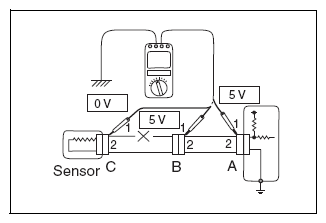 - For cases shown in Fig 12, there is a short circuit between terminals 1 of connectors A and C if the resistance is less than 1 Ω(short circuit) between terminal 1 of connector A and chassis ground, and the resistance between terminal 2 of connector A and chassis ground is 10 kΩ or more.