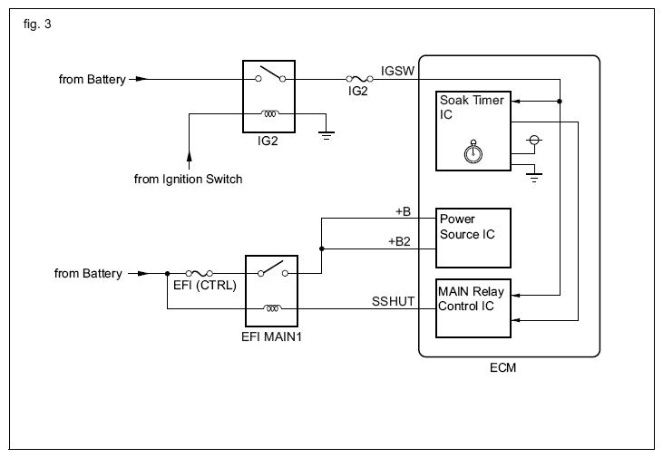 | Soak timer | Integrated into the ECM. In order to ensure the accuracy of the EVAP monitor, 5-hours (+/-15 min.) measurement is performed after ignition switch has been turned to OFF. This will lower the fuel temperature and stabilize the EVAP pressure. After approximately 5 hours have passed, the ECM will start up. (Fig 3) |