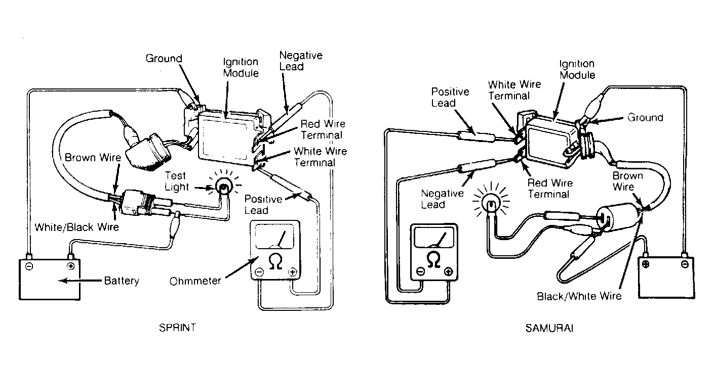 - Connect ohmmeter negative lead to Red wire terminal and positive lead to White wire terminal. Test light should glow, indicating that module is okay. If not, replace ignition module.
