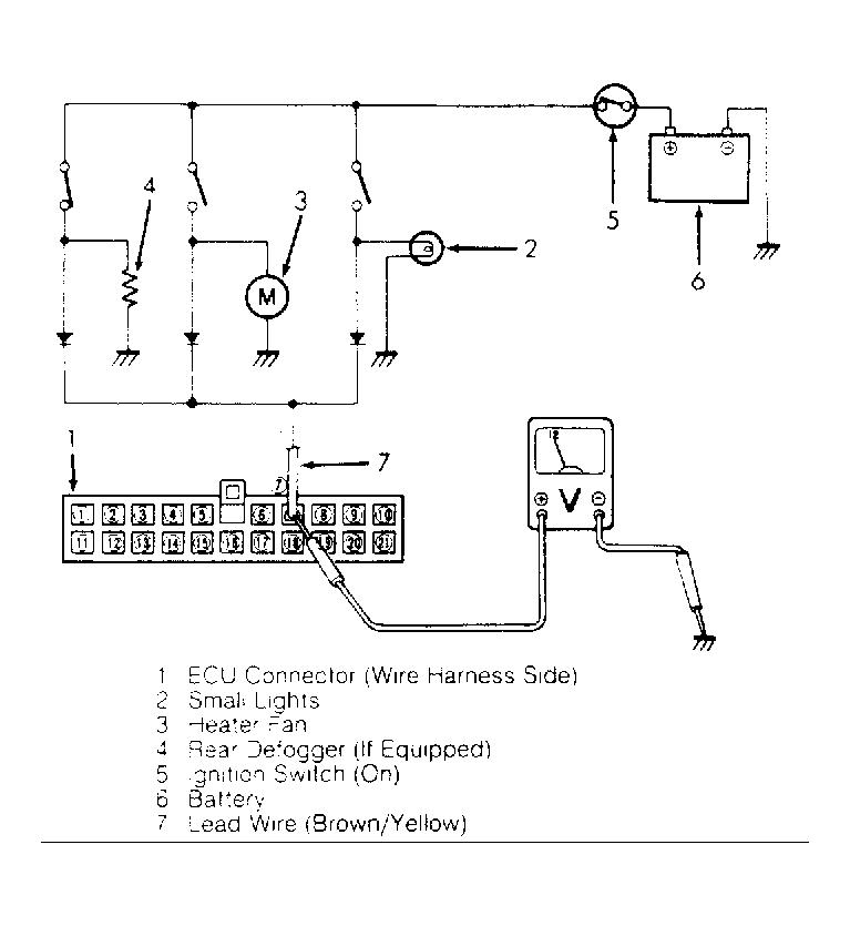 Disconnect ECM connector from ECM. Turn ignition on but do not start engine. Connect a voltmeter between terminal No. 7 (wire harness side) and body ground. See Fig 1 . Operate each component individually and note voltmeter reading. A reading of 11-14 volts should be present. If any component is not within specifications, check and repair that component and/or circuit.