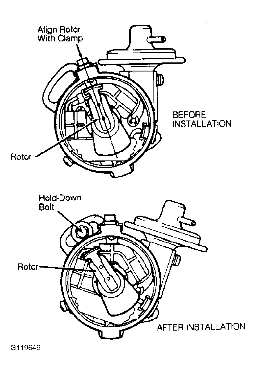- On Sidekick, when distributor is fully seated, rotor should point to center of hold-down bolt. Perform STEP 2. See Fig 2 .