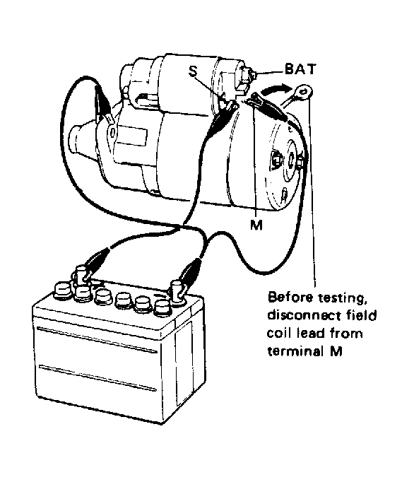Connect test leads to starter. See Fig 1. Connect battery negative leads to starter housing and "M" terminal. Connect battery positive lead to "S" terminal. If starter pinion gear does not move out, replace solenoid.