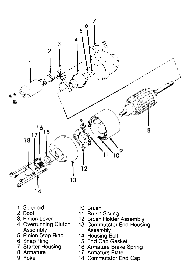 - On conventional type starter, install armature plate and brake spring. See Fig 2. On all models, install 2 bolts and 2 screws holding commutator cover to starter housing. Align solenoid with scribe marks and install to starter housing.
