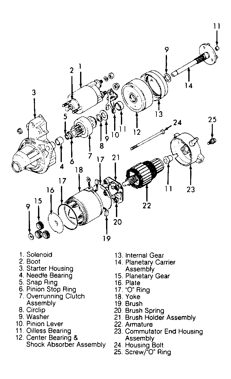 - Lubricate all friction surfaces. On reduction type starter, install center bearing and shock absorber assembly onto planetary carrier shaft, and install circlip. See Fig 1. On all models, install overrunning clutch, pinion stop ring and snap ring(if removed). Install brushes into brush holder.