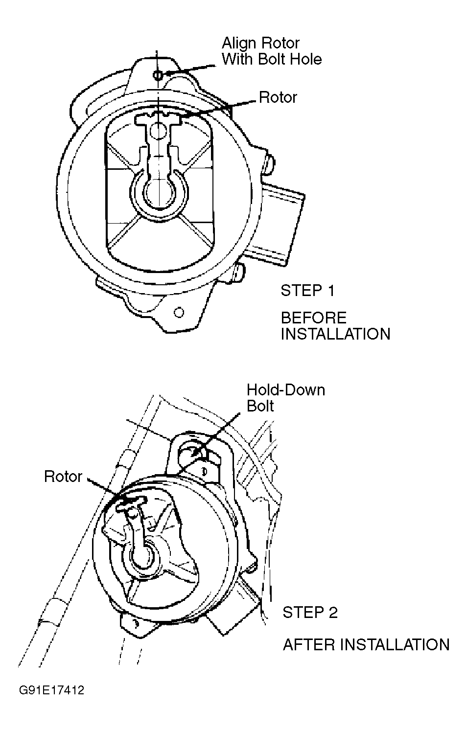 3. Install distributor into gearbox. When distributor is fully seated, rotor should point to center of hold-down bolt. Perform STEP 2. See Fig 1 .