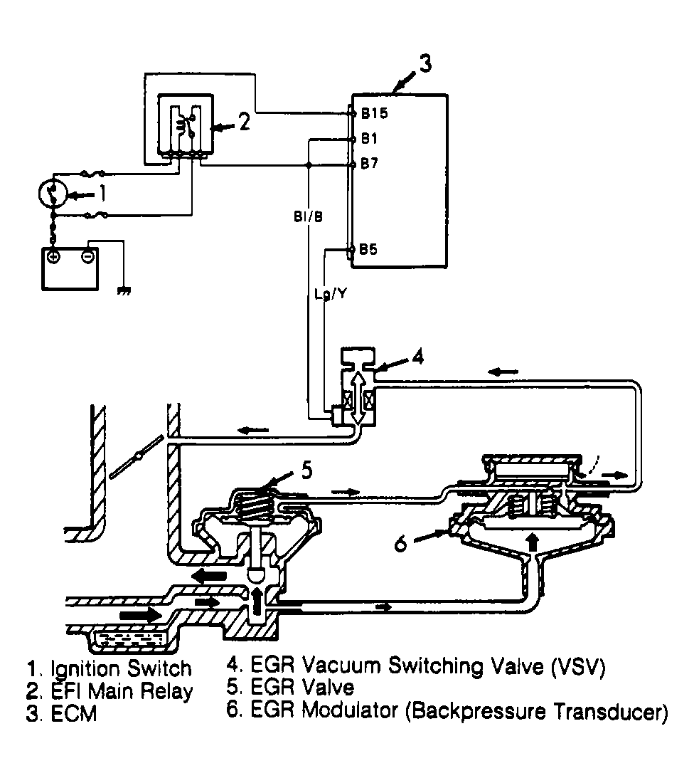 - If EGR valve and EGR modulator (backpressure transducer) are okay, check EGR Vacuum Switching Valve (VSV). See EGR VACUUM SWITCHING VALVE (VSV) under EXHAUST GAS RECIRCULATION (EGR)