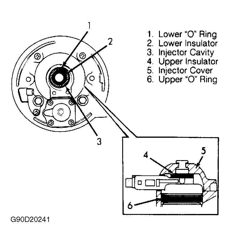 - Apply thin coat of fuel to new upper and lower fuel injector "O" rings. Install lower "O" ring to fuel injector cavity and upper "O" ring to injector. See Fig 1