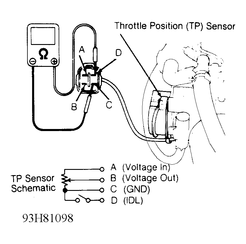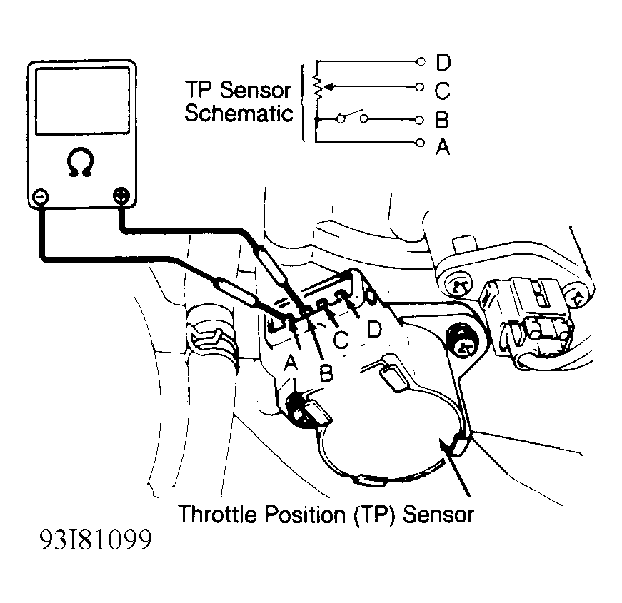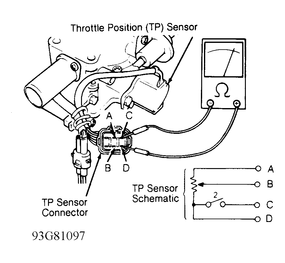 - Disconnect negative battery cable and TP sensor connector. See Fig 1 , Fig 2 or Fig 3 . Using ohmmeter, check resistance between indicated terminals. See THROTTLE POSITION (TP) SENSOR RESISTANCE table. If resistance is not as specified, adjust TP sensor.