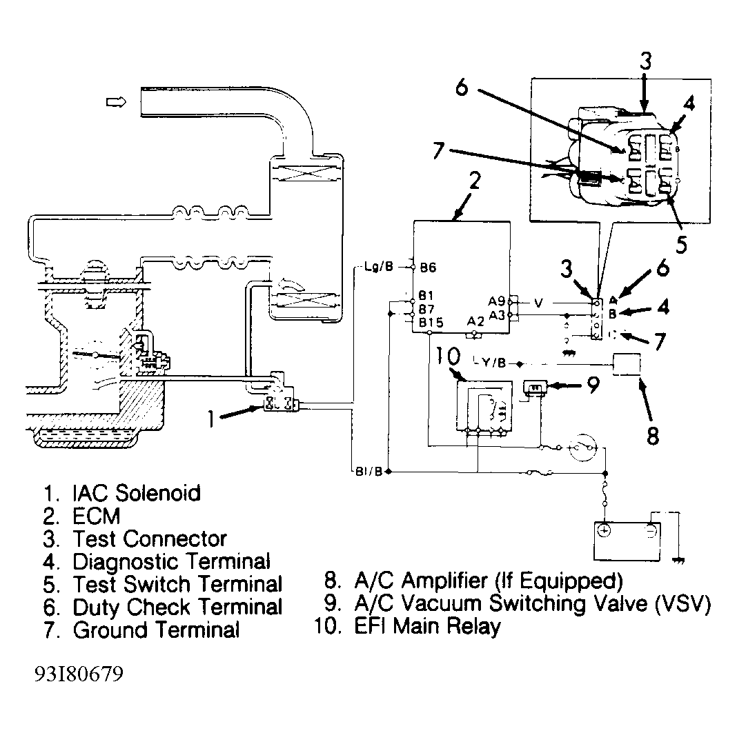 7. Ensure no vacuum leaks are present in air intake system or A/C Vacuum Switching Valve (VSV). Adjust idle speed and IAC duty. See ADJUSTMENTS article. If idle speed cannot be adjusted, check air valve. See FAST IDLE AIR (FIA) VALVE  under IDLE CONTROL SYSTEM.