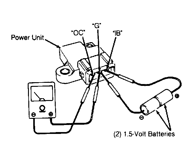 2. To test igniter, turn ignition off. Remove igniter from under ignition coil. Tape together two 1.5-volt dry cell batteries in series to create a 3-volt power source. Connect a jumper wire from igniter terminal "G" to negative side of 3-volt power source. Connect another jumper wire from igniter terminal IB to positive side of 3-volt power source. See Fig 1 .