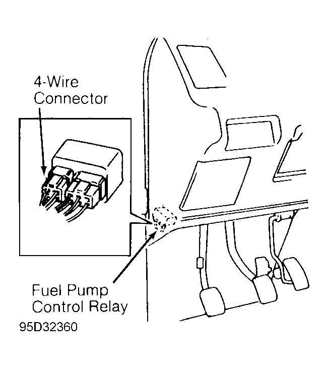 1. Place transmission in Neutral or Park and set parking brake. Disconnect 4-wire connector from fuel pump relay, located under left side of dash, left of ECM. See Fig 1 .