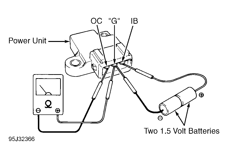 2. To test ignitor, turn ignition off. Remove ignitor from under ignition coil. Tape together two 1.5-volt dry cell batteries in series to create a 3-volt power source. Connect a jumper wire from ignitor terminal "G" to negative side of 3-volt power source. Connect another jumper wire from ignitor terminal IB to positive side of 3-volt power source. See Fig 1 .