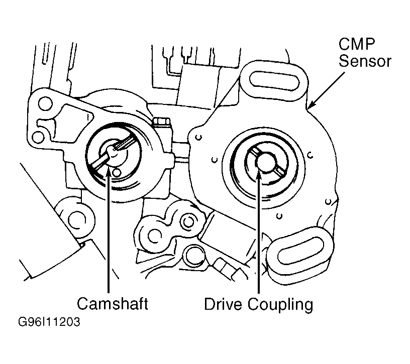 - Install NEW "O" ring on CMP sensor and coat with engine oil. Install CMP sensor while aligning drive coupling into slot of camshaft. See Fig 1. CMP sensor drive coupling and camshaft slot are offset. If CMP sensor coupling does not fit into slot, turn CMP sensor shaft 180 degrees.