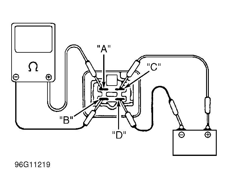 3. Turn ignition off. Remove fuel pump relay. Using an ohmmeter, measure resistance between fuel pump relay terminals. See Fig 1 . Continuity should not exist between terminals "A" and "B". Resistance between terminals "C" and "D" should be 63-77 ohms at 68°F (20°C). Continuity should exist between terminals "A" and "B" as battery voltage and ground are applied to terminals "C" and "D". If resistance is as specified, go to next step. If resistance is not as specified, replace fuel pump relay. Retest system.
