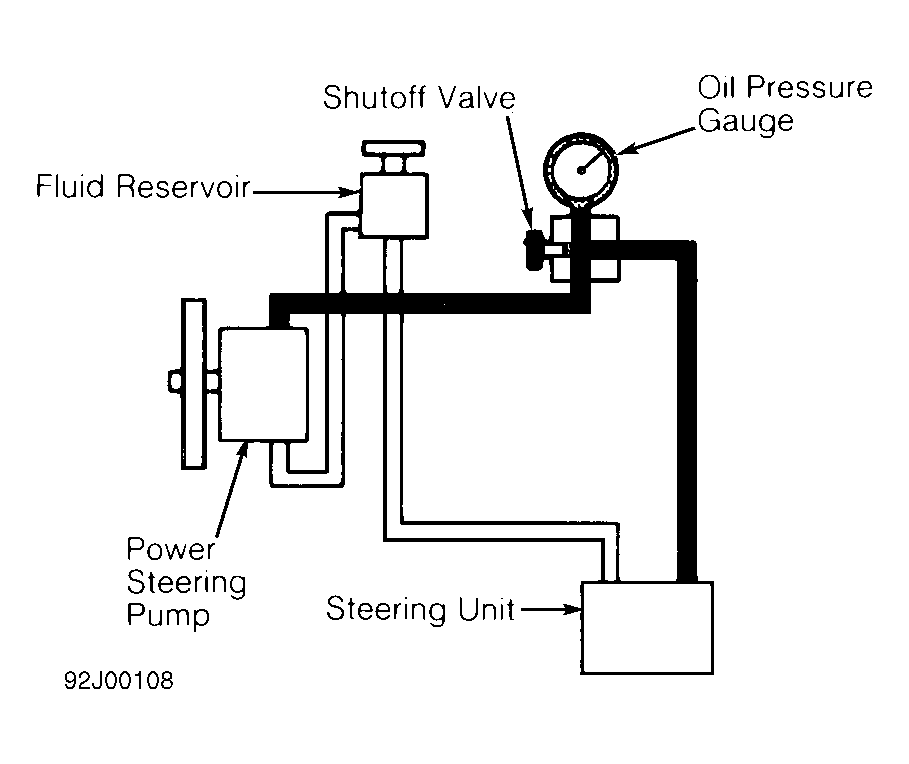 - With engine off, disconnect pressure hose from pump. Install an oil pressure gauge between power steering pump and steering unit. See Fig 1 .
