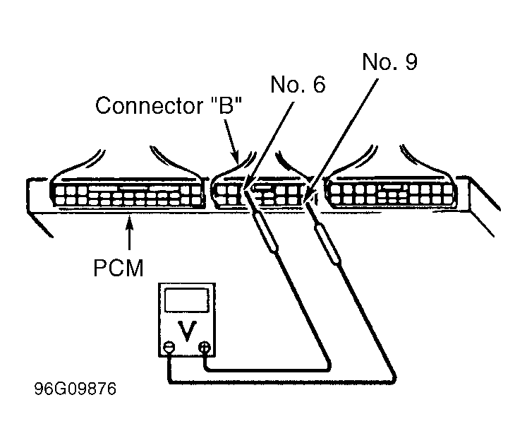 Using a voltmeter, backprobe between PCM connector "B", terminals No. 6 (Light Green/White wire) and No. 9 (Light Green/Black wire). See