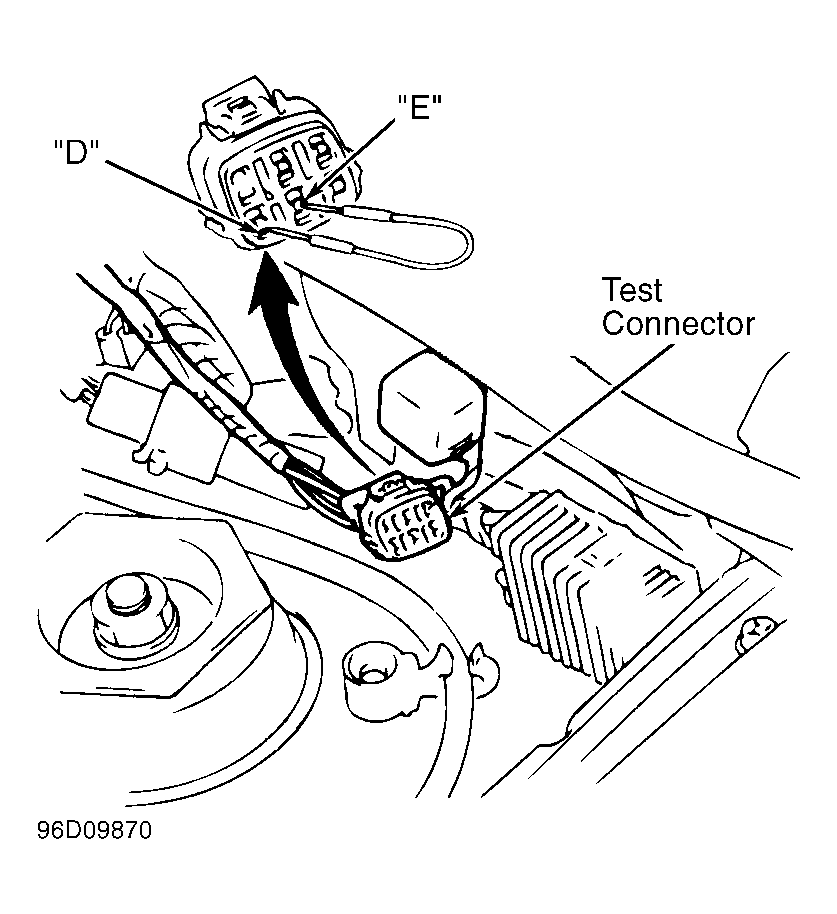 (2) With jumper wire installed between terminals "D" and "E" of test connector, located next to left strut tower. See Fig 2 .