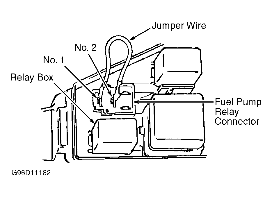- Turn ignition off. Remove fuel pump relay from engine compartment relay box. Using a fused jumper wire, connect terminal cavities No. 1 and 2 together. See Fig 2 . Turn ignition on. If fuel pump is heard, go to next step. If fuel pump is not heard, check for open in Pink wire, Black wire or White/Black wire to fuel pump relay connector. Repair as necessary. If wires are okay, replace fuel pump. Retest system.