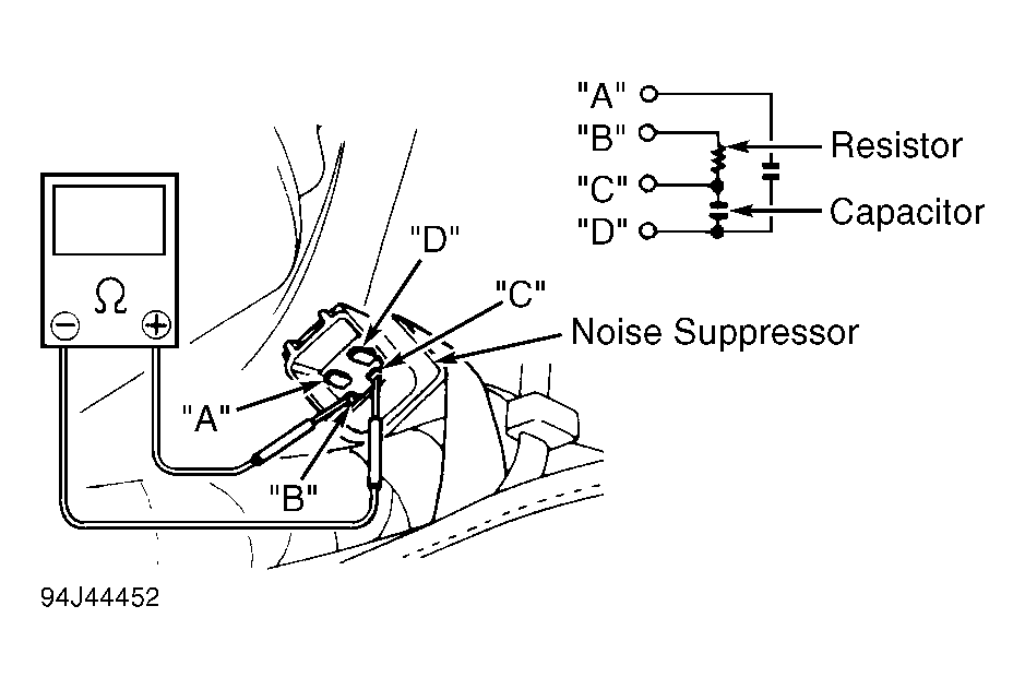 Disconnect harness connector from noise suppressor located near ignitor/coil assembly. Using an ohmmeter, ensure continuity does not exist between terminals "A" and "B". See Fig 1 . Ensure resistance between terminals "B" and "C" is about 2200 ohms. If either test result is not within specification, replace noise suppressor.