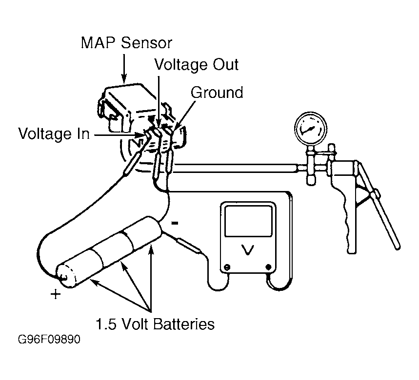 - Disconnect vacuum hose from MAP sensor. Remove MAP sensor. Connect three 1.5 volt batteries in series. Connect positive terminal of batteries to "Vin" terminal of MAP sensor. See Figure . Connect negative terminal of batteries to "Ground" terminal of MAP sensor. Using a voltmeter, measure voltage between terminals "Vout" and "Ground" of MAP sensor. Ensure voltage is as specified. See MAP SENSOR OUTPUT VOLTAGE table. Ensure voltage decreases as vacuum (up to 15 in. Hg) is supplied to MAP sensor. Replace MAP sensor if voltage is not as specified. If MAP sensor tests okay, replace PCM. Retest system.