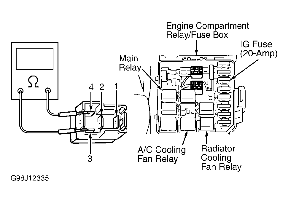 - Check continuity between main relay terminals No. 1 and 2. Continuity should not exist. Apply battery voltage to terminal No. 3, and ground to terminal No. 4, of main relay. Continuity should exist between terminals No. 1 and 2 when energized. If continuity is as specified, go to next step. If continuity is not as specified, replace main relay.