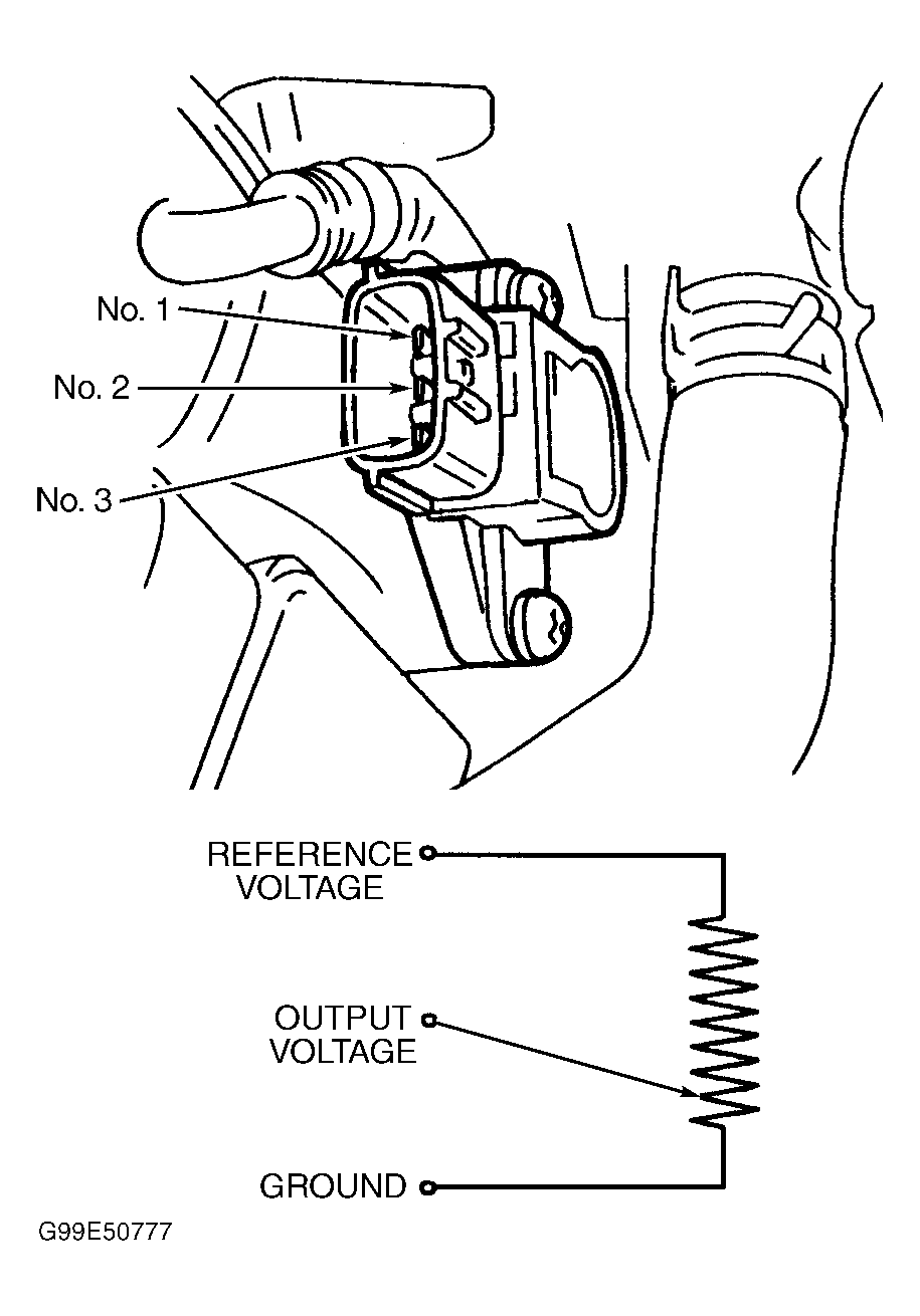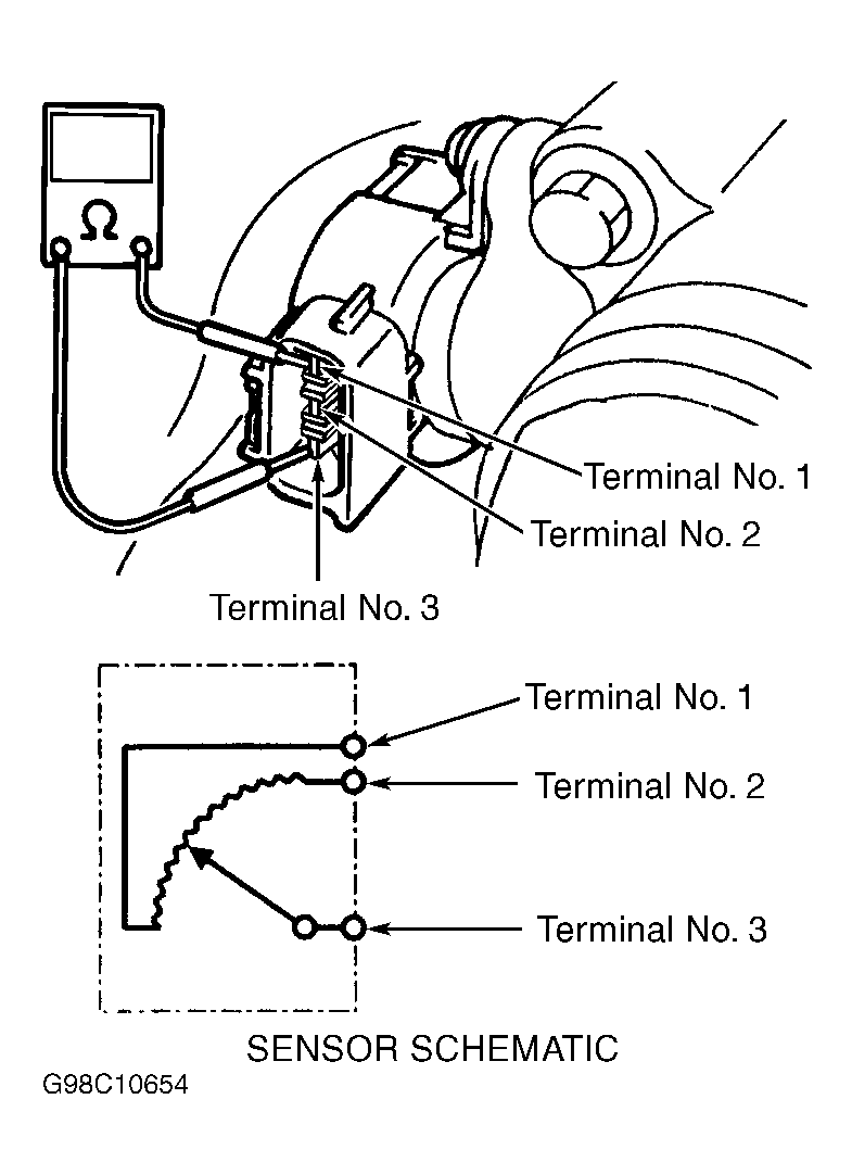 - Disconnect negative battery cable and TP sensor connector. See Fig 1 or Fig 2. Using an ohmmeter, check resistance between indicated terminals. See THROTTLE POSITION (TP) SENSOR RESISTANCE table.