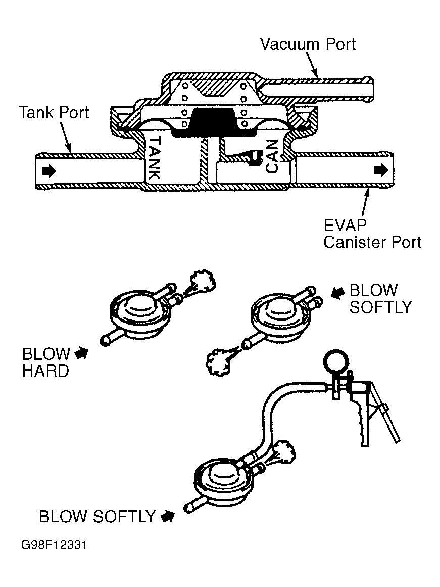 - Use vacuum pump attached at vacuum port to open valve. Blow into TANK port. Air should freely flow out of CAN port. If valve does not operate as specified, replace tank pressure control valve and retest.