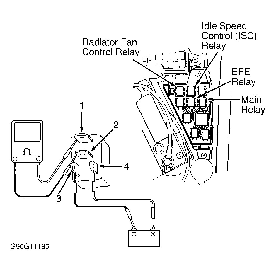 - Turn ignition off. Remove main relay. Measure resistance between main relay terminals No. 3 and 4. See Fig 1. Resistance should be 79-95 ohms. If resistance is as specified, go to next step. If resistance is not as specified, replace main relay.