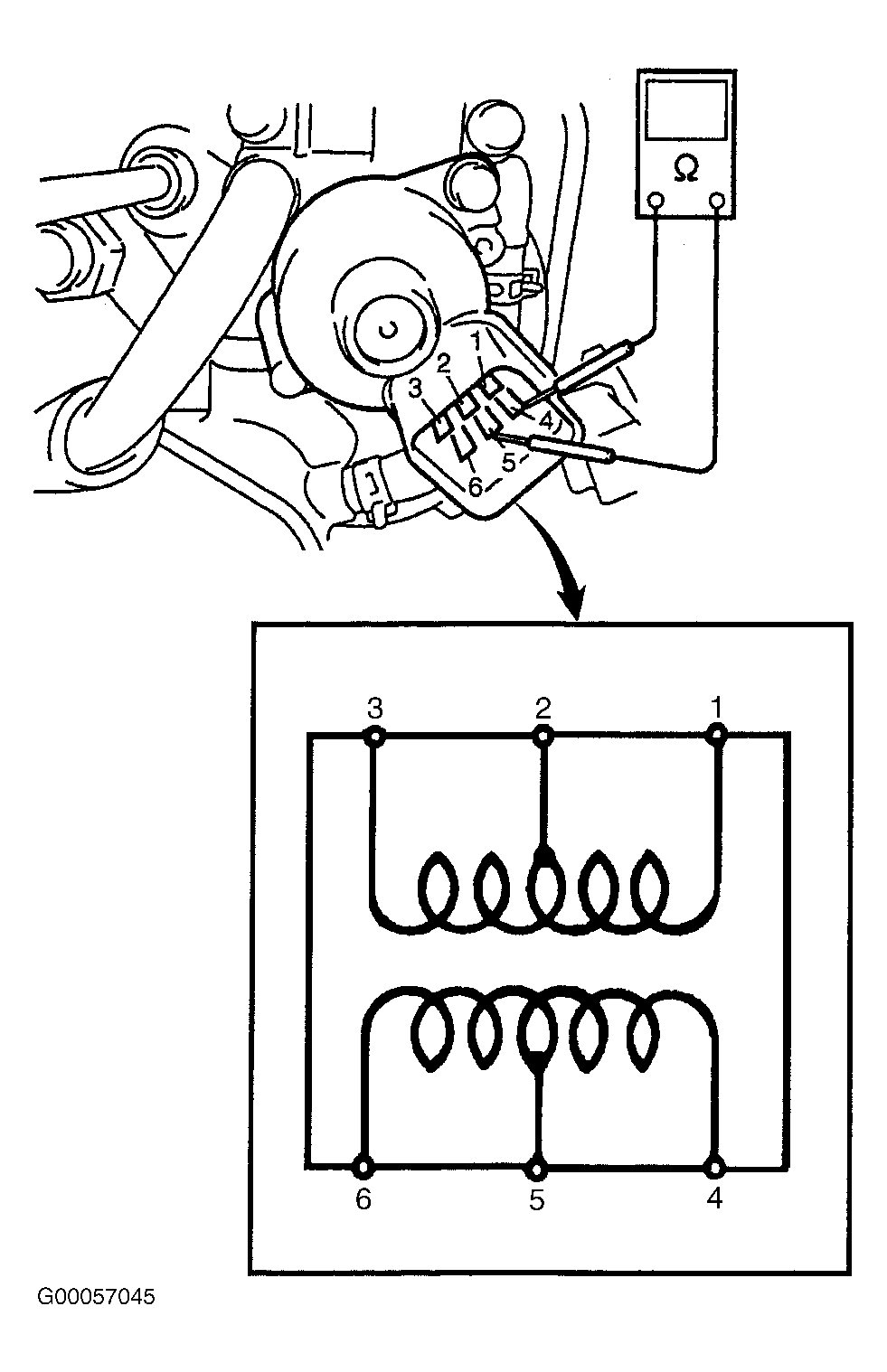 - Remove IAC valve electrical connector. Using DVOM, check resistance of IAC valve between terminals "1" and "2", "2" and "3", "4" and "5", and "5" and "6". See Fig 1