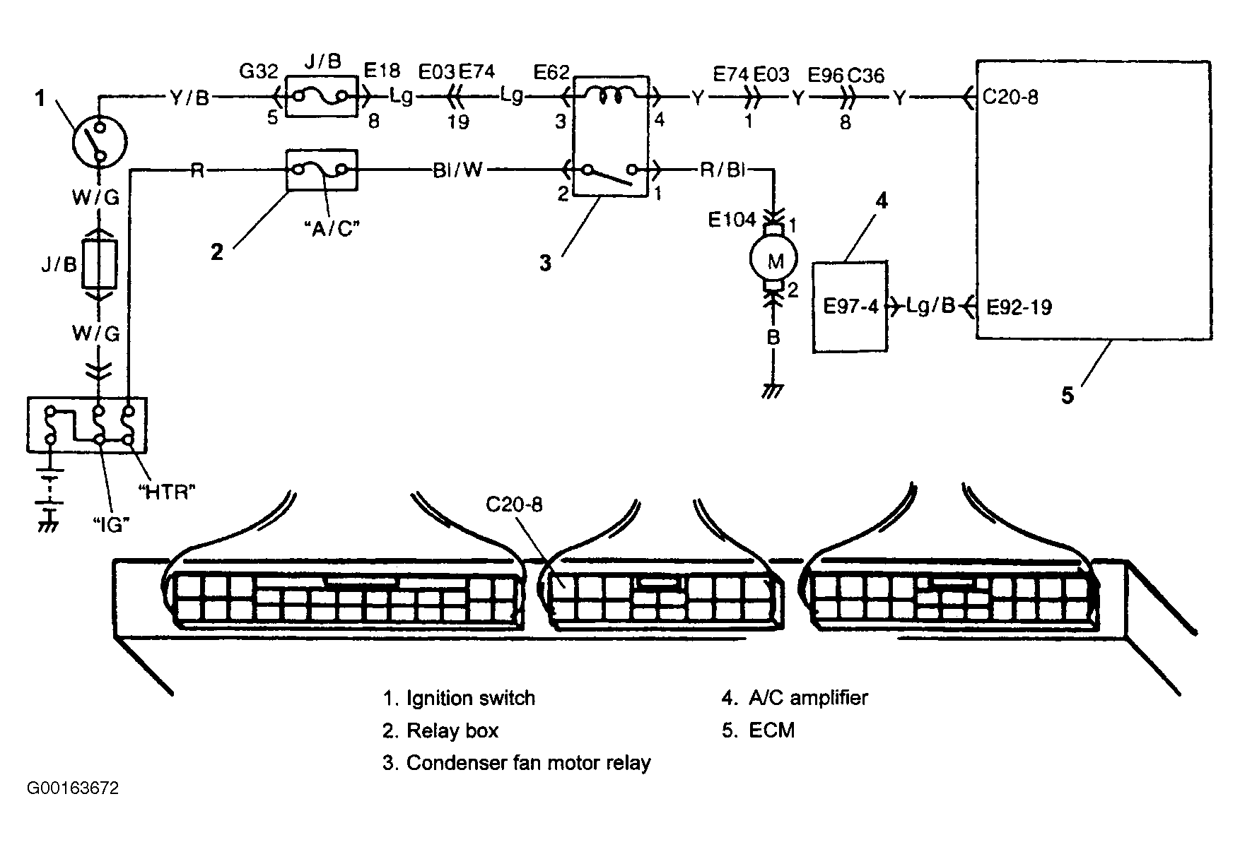 1. Turn ignition on. Backprobing at ECM, measure voltage between ground and ECM connector E92 terminal No. 19 (Light Green/Black wire). See Fig 1 . With A/C and blower switch Off, voltage should be 10-14 volts. With A/C and blower switch On, voltage should about zero volt. If voltage readings are as specified, go to next step. If voltage readings are not as specified, check for open or short in Light Green/Black wire between ECM and A/C control module. See WIRING DIAGRAMS article. If no problem with wiring is found, check for A/C malfunction. See appropriate MANUAL or AUTOMATIC A/C-HEATER SYSTEMS article in AIR CONDITIONING & HEATING.