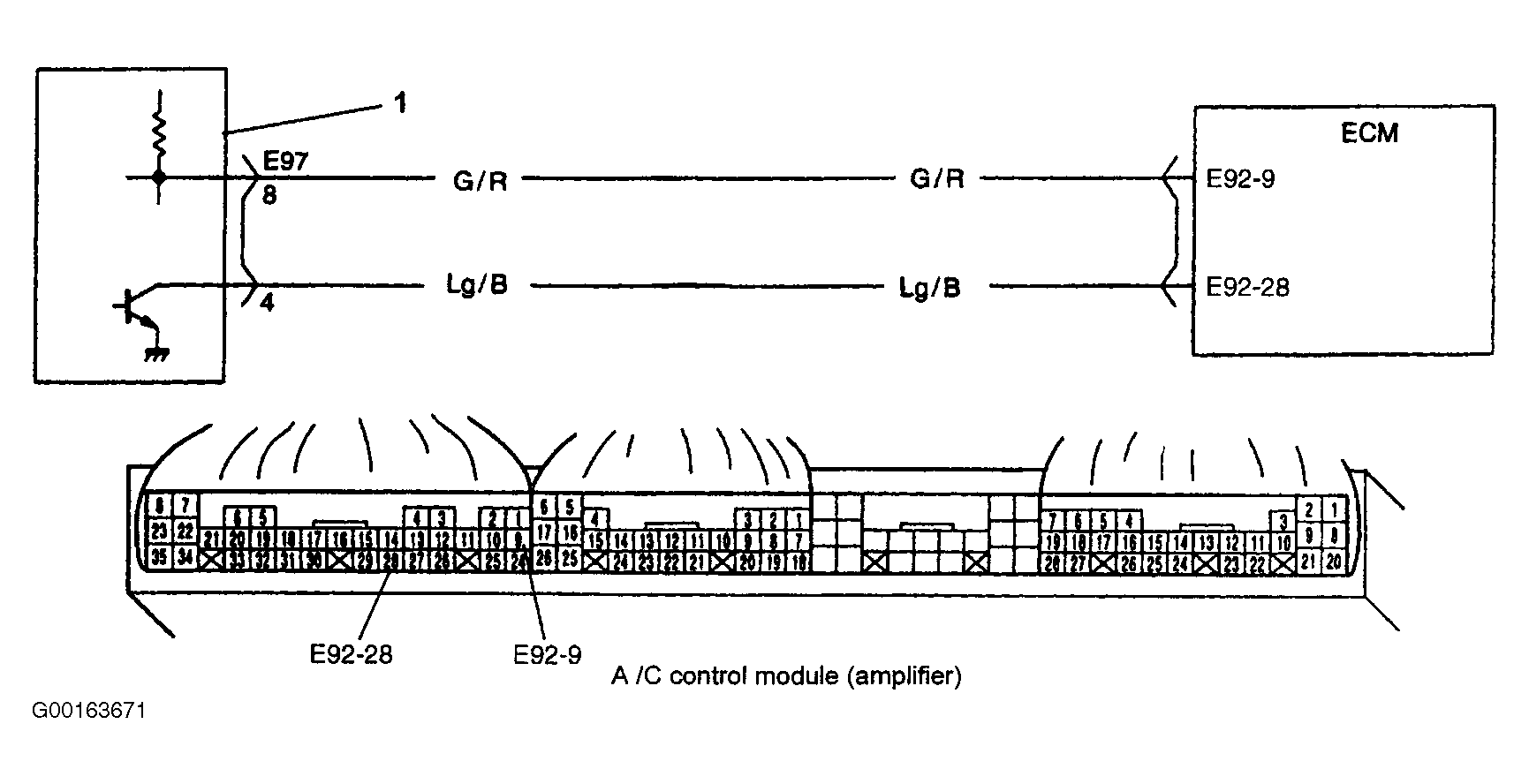 2. Turn ignition on. Backprobing at ECM, measure voltage between ground and ECM connector E92 terminal No. 9 (Green/Red wire). With A/C and blower switch Off, voltage should be 0-1 volts. With A/C and blower switch On, voltage should be 10-14 volts. If voltage readings are as specified, A/C circuit s are okay. If voltage readings are not as specified, go to next step.