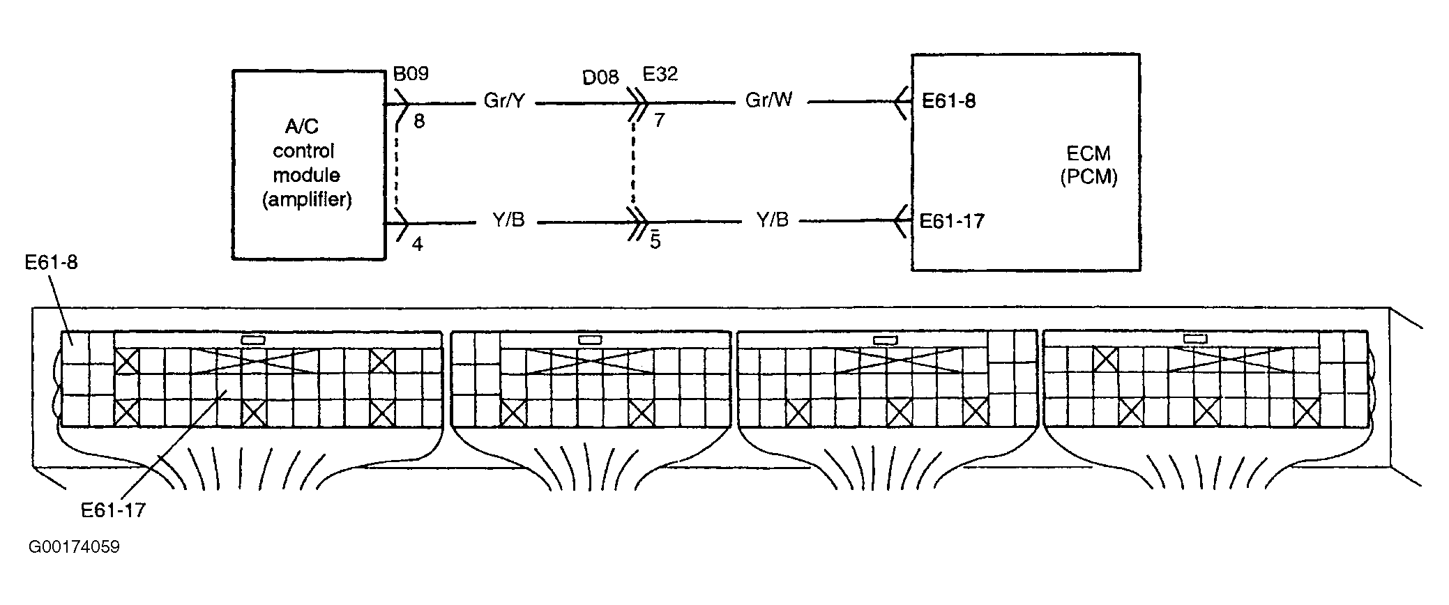 - Check for open or short in Grey/White or Grey/Yellow wire between A/C amplifier and ECM. See Fig 1