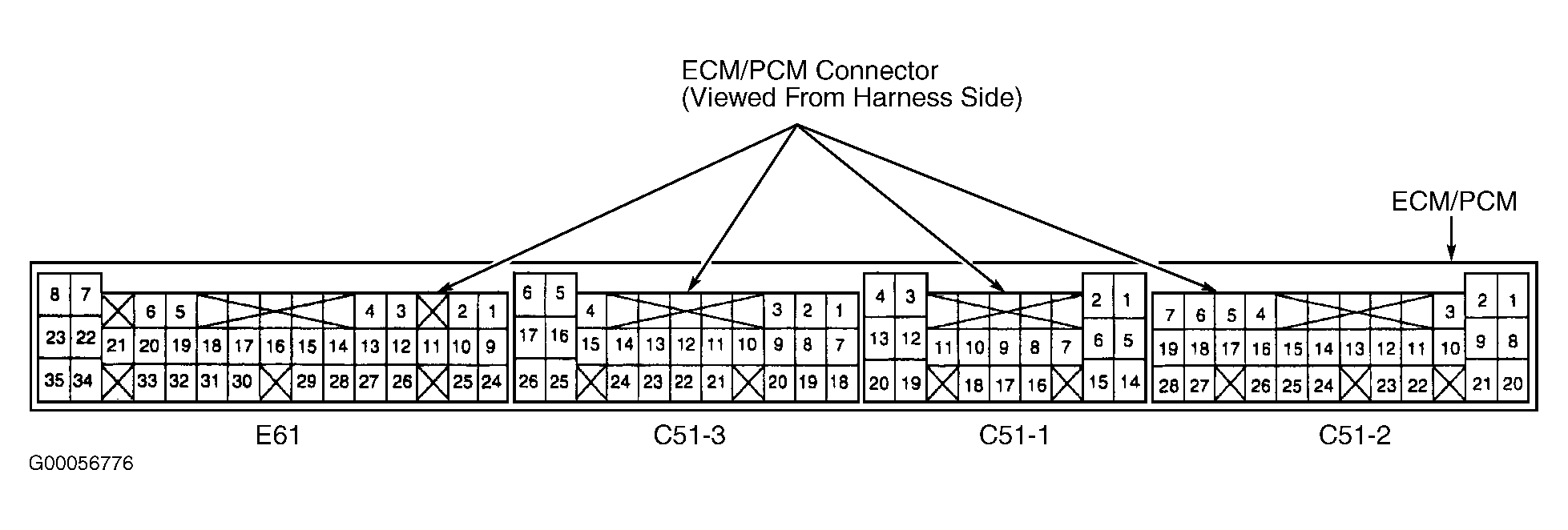 - Turn ignition off. Disconnect ECM 35-pin harness connector E61. ECM is located under instrument panel, behind glove box. See Figure. Check for poor terminal contact at ECM harness connector E61. If problem is found, repair as necessary. After repair, retest system. If terminal contact is okay, go to next step.