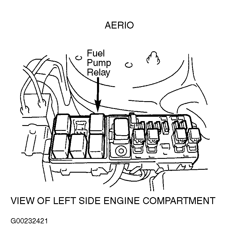 1. Place transmission in Neutral (M/T) or Park (A/T). Set parking brake and block drive wheels. Disconnect fuel pump relay. Fuel pump relay is located in engine compartment relay box (Aerio), and under left side of dash panel (Grand Vitara, Vitara and XL-7). See Fig 1 -Fig 3 .