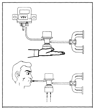 - Disconnect vacuum hose between mixture control valve and vacuum switching valve (at vacuum switching valve). Start engine, place hand over mixture control valve inlet port, and check for vacuum.