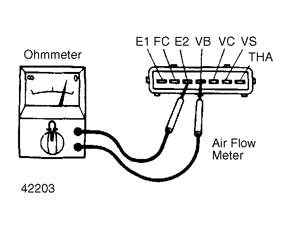 Turn ignition off. Disconnect wiring connector from air flow meter. Using an ohmmeter, measure resistance between each terminal. See Fig 1. If resistance values do not meet specifications shown in chart, replace air flow meter.